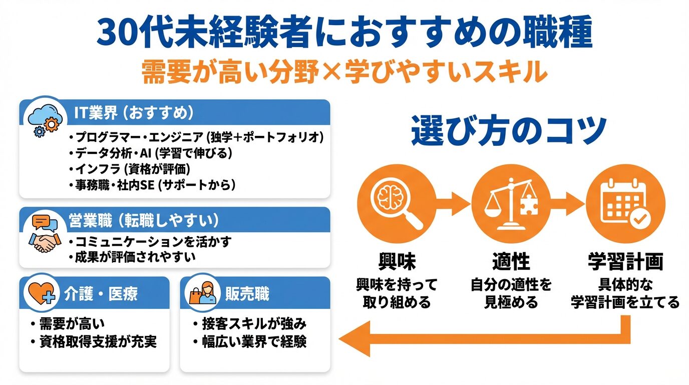 IT業界は、30代未経験者にとって最もおすすめできる分野の一つです。需要が高く、スキル習得がしやすく、リモートワークの機会も豊富という三拍子が揃っています。
