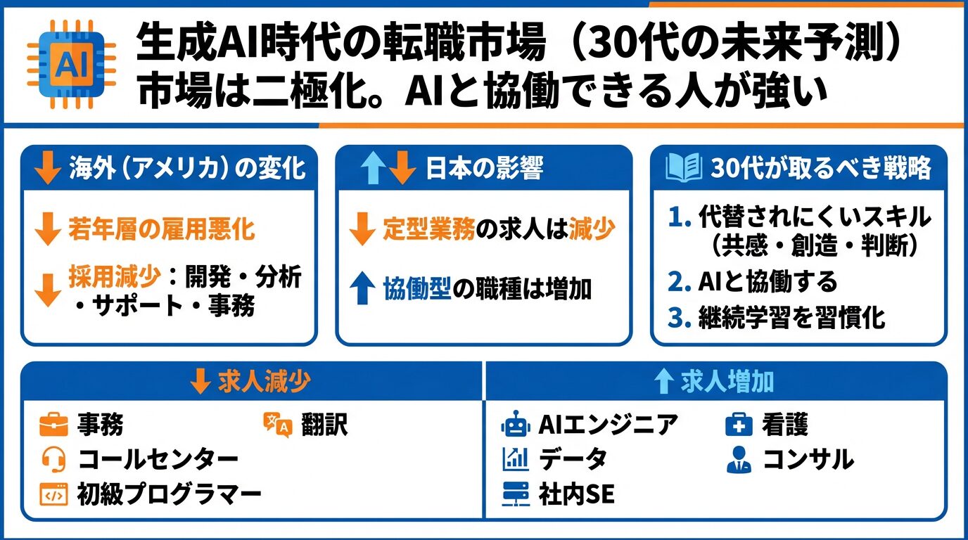 生成AIの発展は、転職市場に大きな影響を与えています。しかし、これは必ずしも悲観的に捉える必要はありません。むしろ、30代という経験と柔軟性を兼ね備えた年齢だからこそ、AI時代に適応できる可能性があります。
