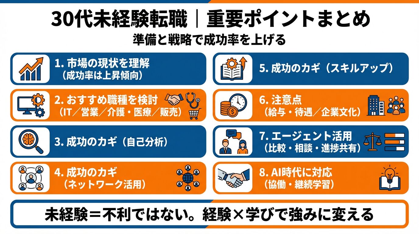 30代で未経験の分野に転職することは、決して不可能なことではありません。本記事で紹介したように、適切な準備と戦略を持って臨めば、成功の可能性は十分にあります。
