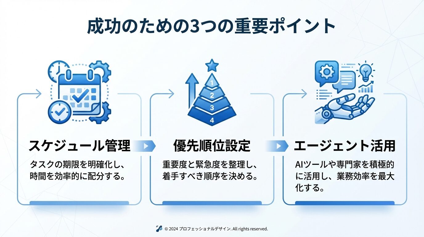 - スケジュール管理を徹底する: 明確な目標と期限を設定し、進捗を定期的に確認しながら計画的に進める