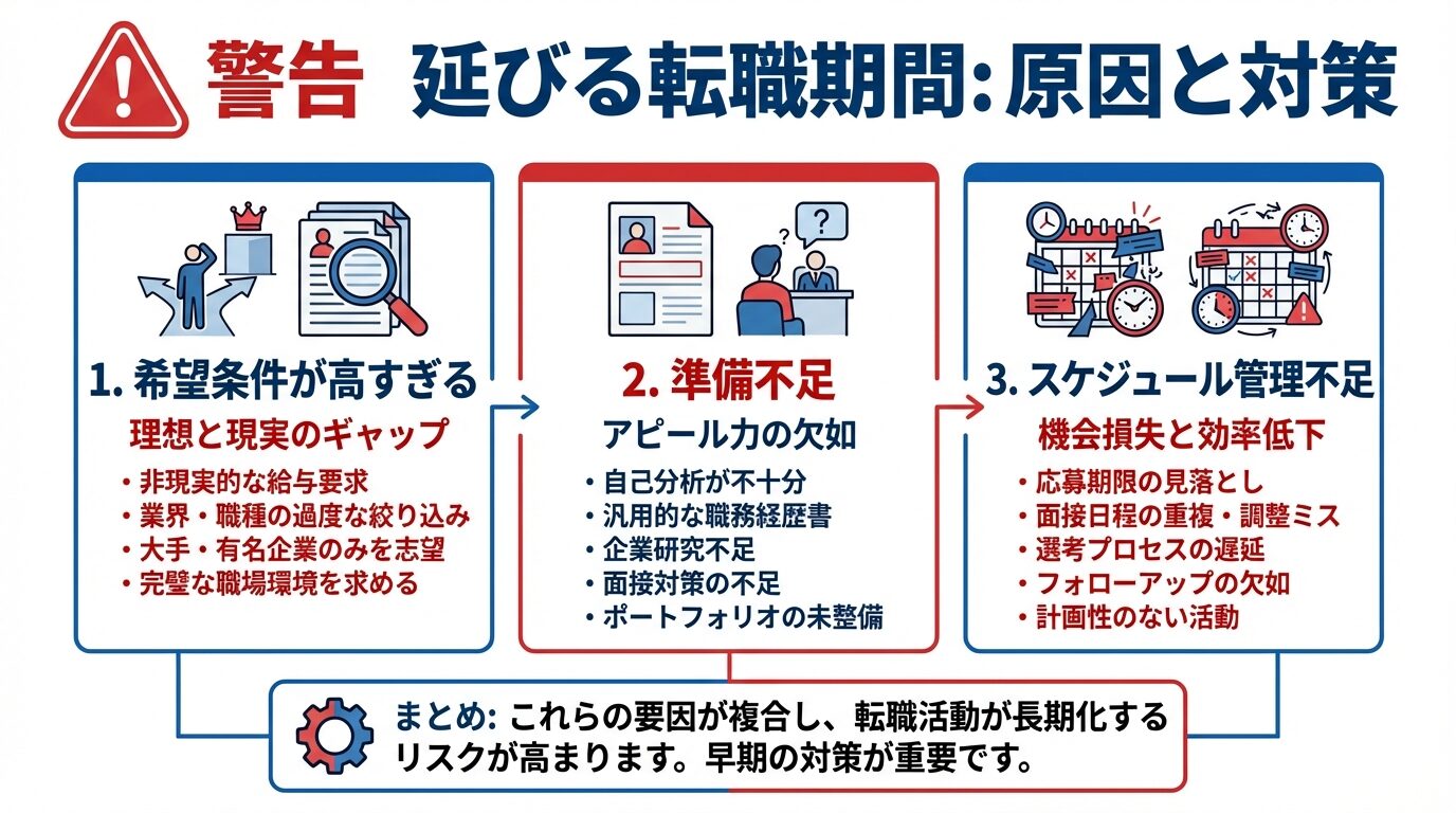 準備不足や応募のタイミングが遅れることも、転職活動が長引く大きな原因です。