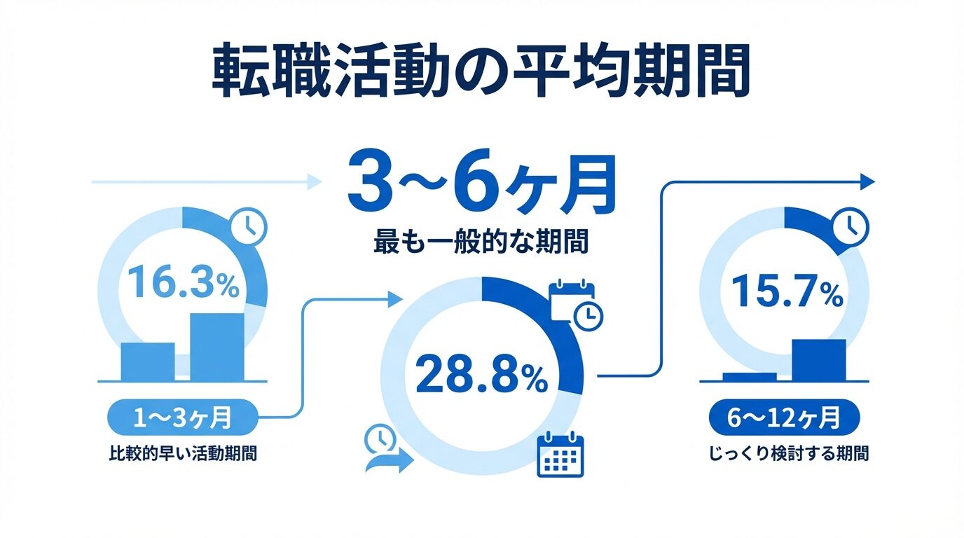 厚生労働省の調査によると、転職活動を始めてから離職するまでの期間は「1〜3ヶ月」が最も多く(28.8%)、全体の62.8%が6ヶ月以内となっています。ただし、年代や業界によって異なるため、自分の状況に合わせた計画が重要です。在職中に準備を始め、時間的な余裕を持って進めることが成功の鍵となります。