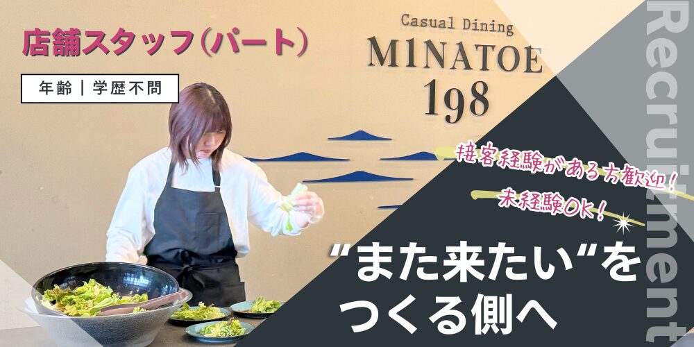 この職種を通じて、ニシオカ工業株式会社が運営するカジュアルダイニングMINATOE 198は、食事の時間を通して、人と人がつながる心地よい場を地域に提供しています。