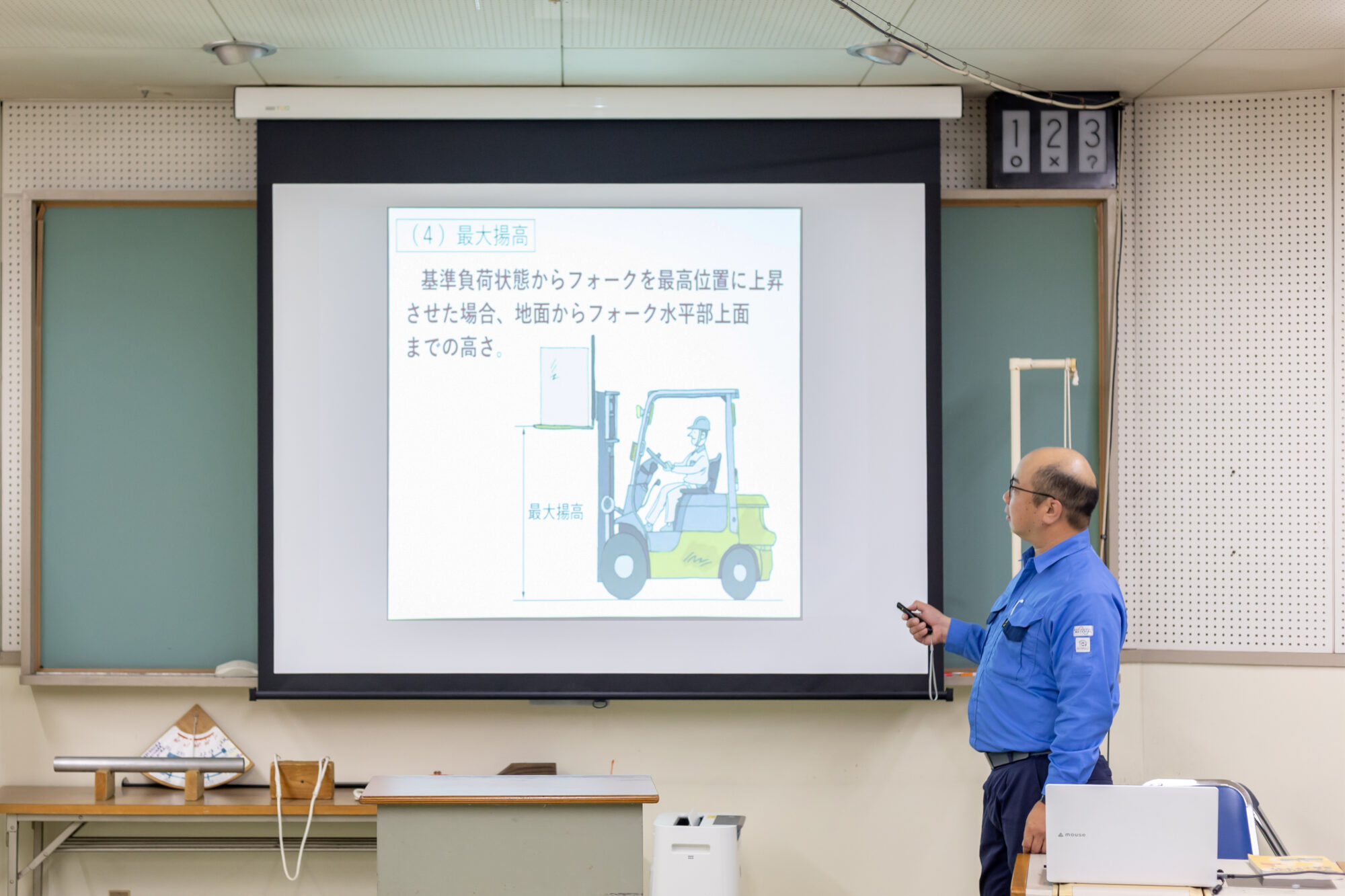 指導資格を取得した後は、実技だけでなく教室での学科講習も担当します。教習資料を使いながら、機械の構造・安全ルール・法令知識などを講義形式で解説。受講生の理解度を確認しながら、“現場で安全に働くための知識”を伝えていきます。