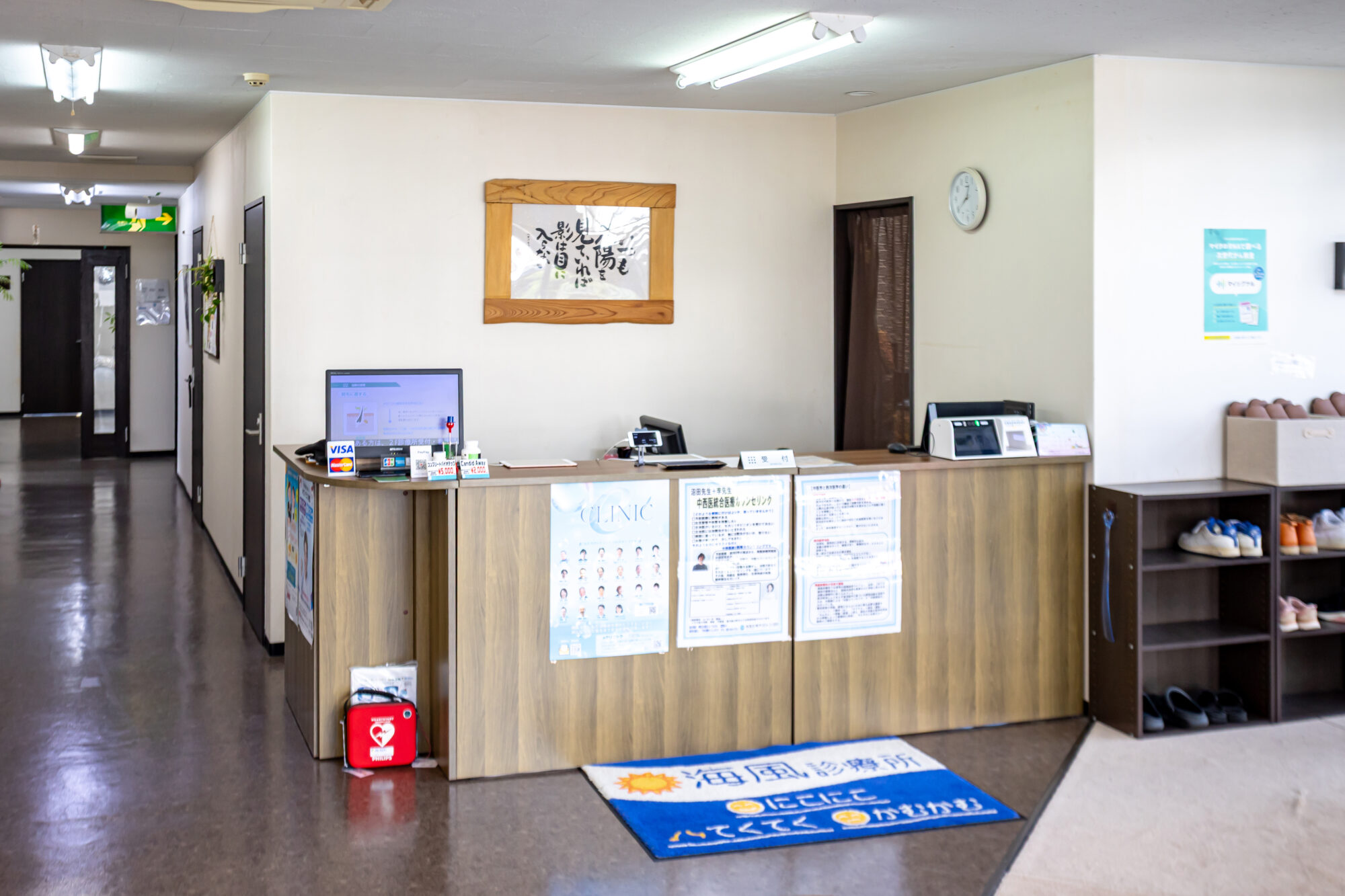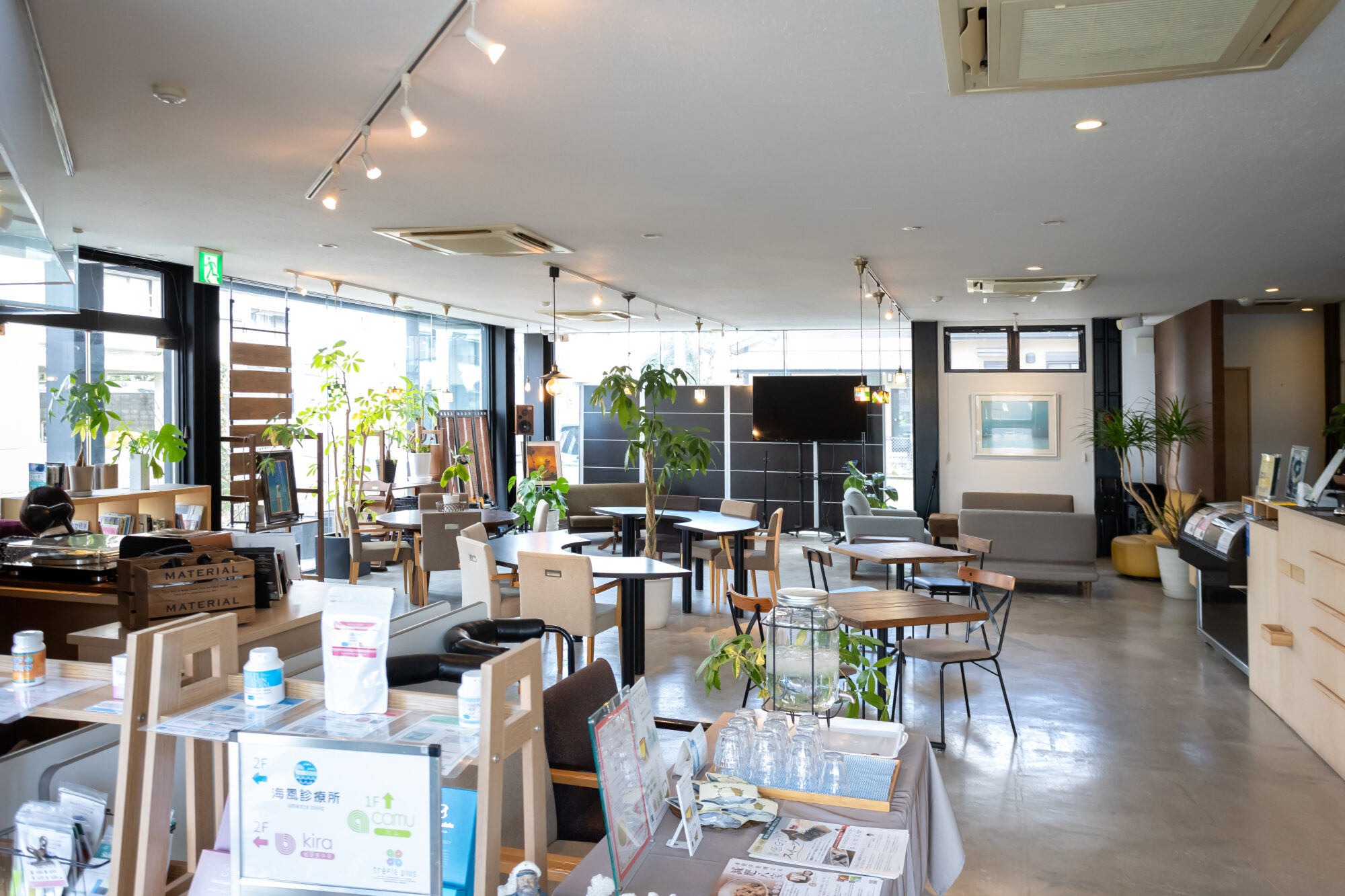 海風診療所は、1階にカフェ、2階に診療所、3階にフィットネスジムを併設した、明るく開放的な統合医療施設です。診療所のフロアは清潔感があり、落ち着いた雰囲気の中で患者様をお迎えしています。